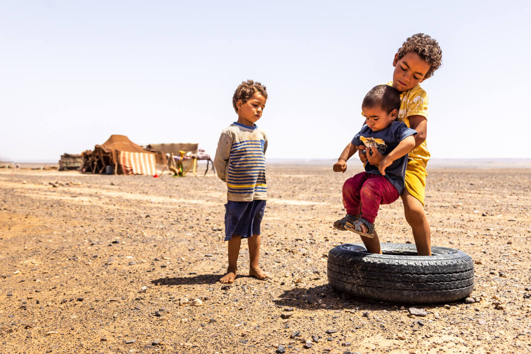 Houssin told me about the changeability of the dunes in the desert, explaining that despite everything, the desert conveyed a constant feeling of vastness. During the jeep ride, I was captivated by a swirl of sand and children playing barefoot in the hot sun. Despite my foot injuries, I could not help but admire them.